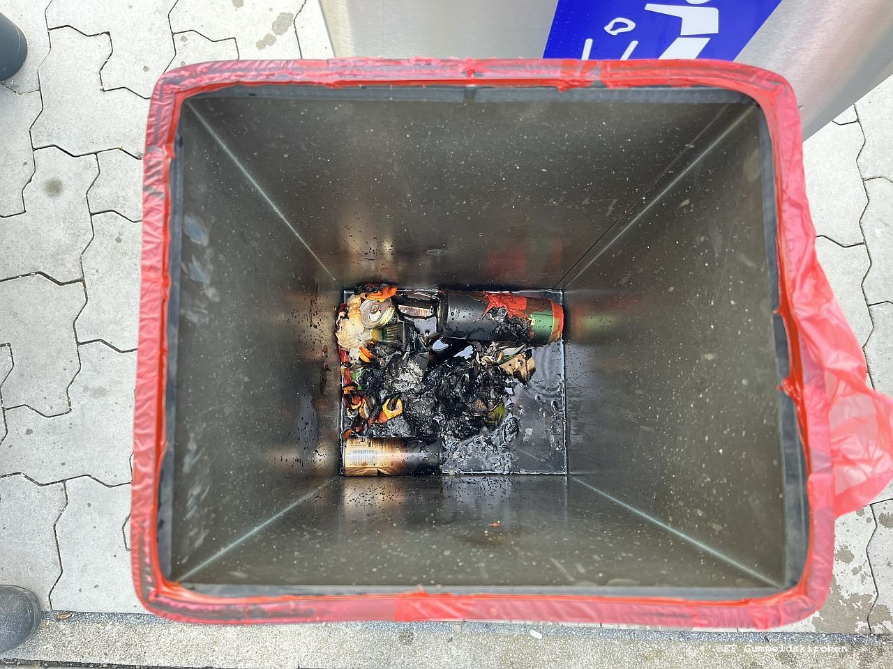 Beim Eintreffen der Einsatzkräfte stellte die Mannschaft fest, dass der Abfallbehälter nicht in Brand stand, sondern stark rauchte bzw. gloste. Die glosenden Materialien wurden umgehend mittels Kübelspritze abgelöscht.