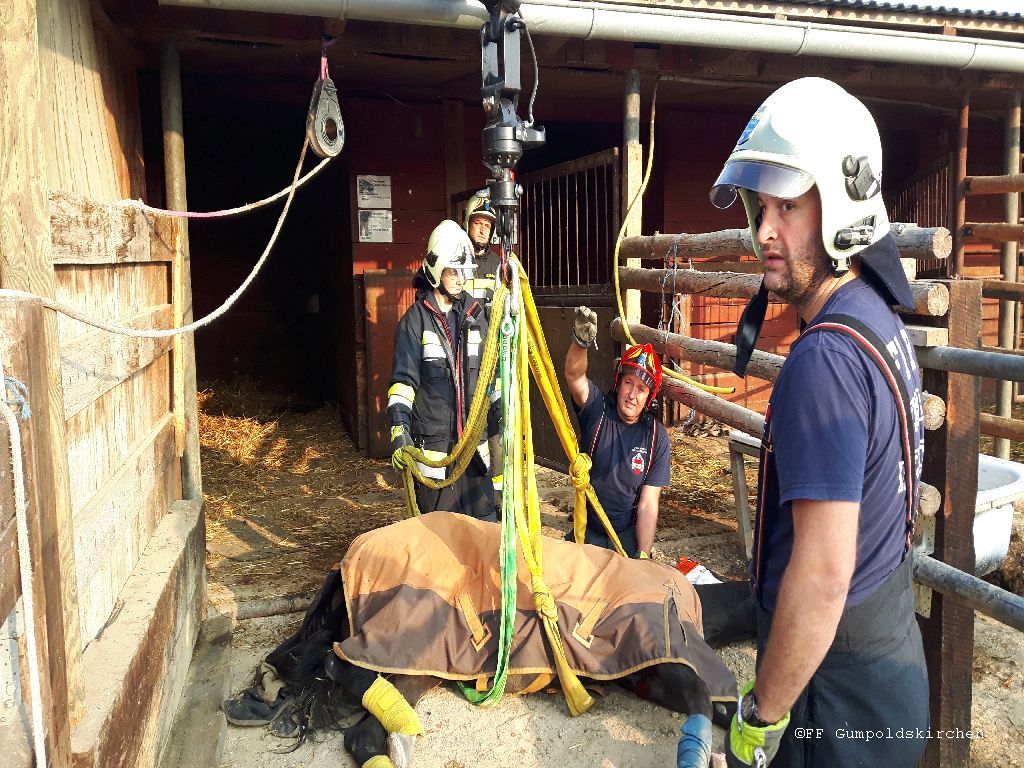 Am 28.09.2016 um 07:22 wurden wir zu einer Tierrettung auf eine Pferdekoppel gerufen. Ein Pferd lag in Seitenlage am Boden und konnte nicht mehr selbstständig aufstehen. Gemeinsam mit dem Tierarzt wurde mittels Bandschlingen und Arbeitsleinen versucht das Pferd wieder auf die Beine zu bekommen. Dadurch der Einsatz der Anschlagmittel nicht zum gewünschten