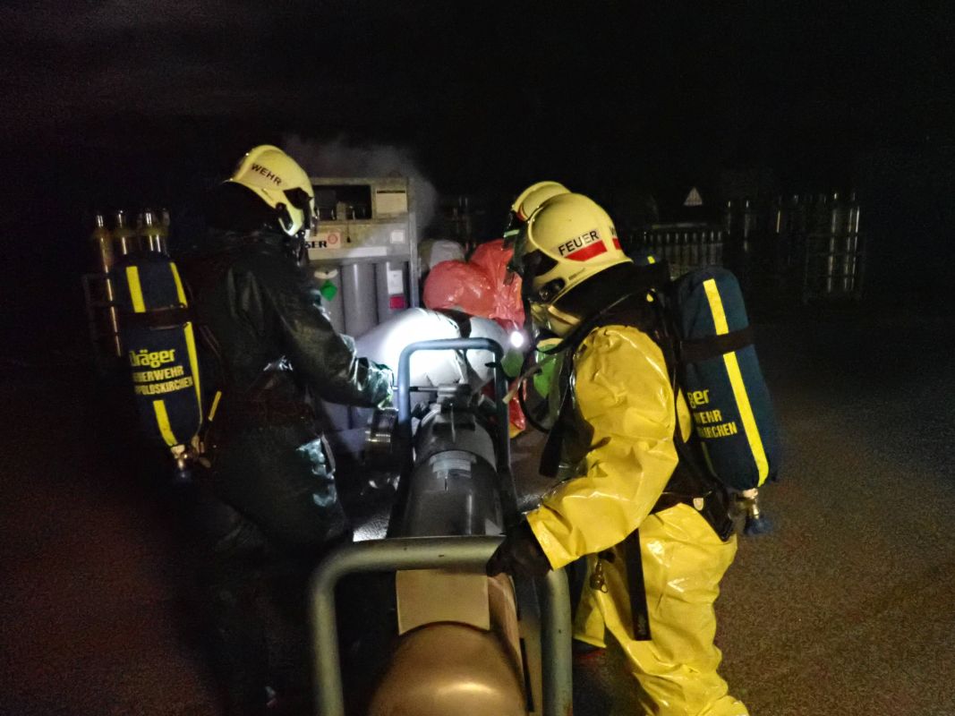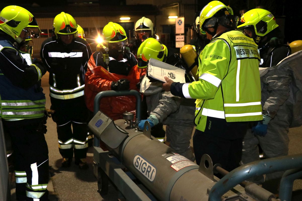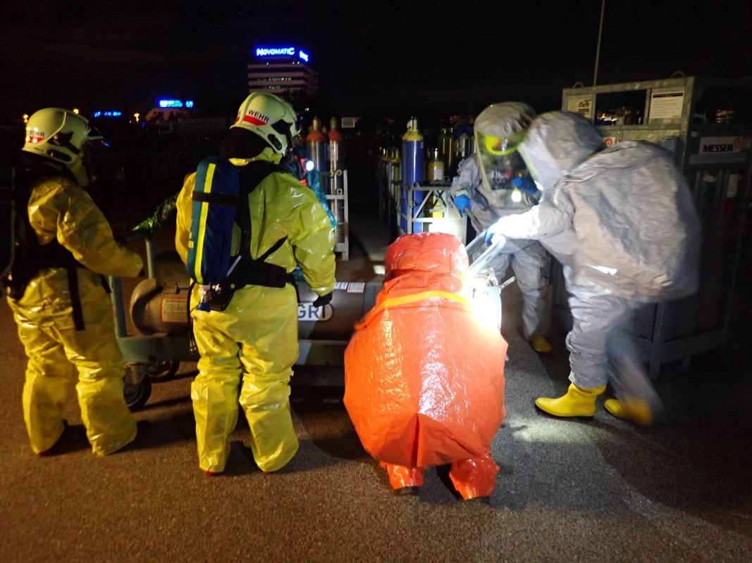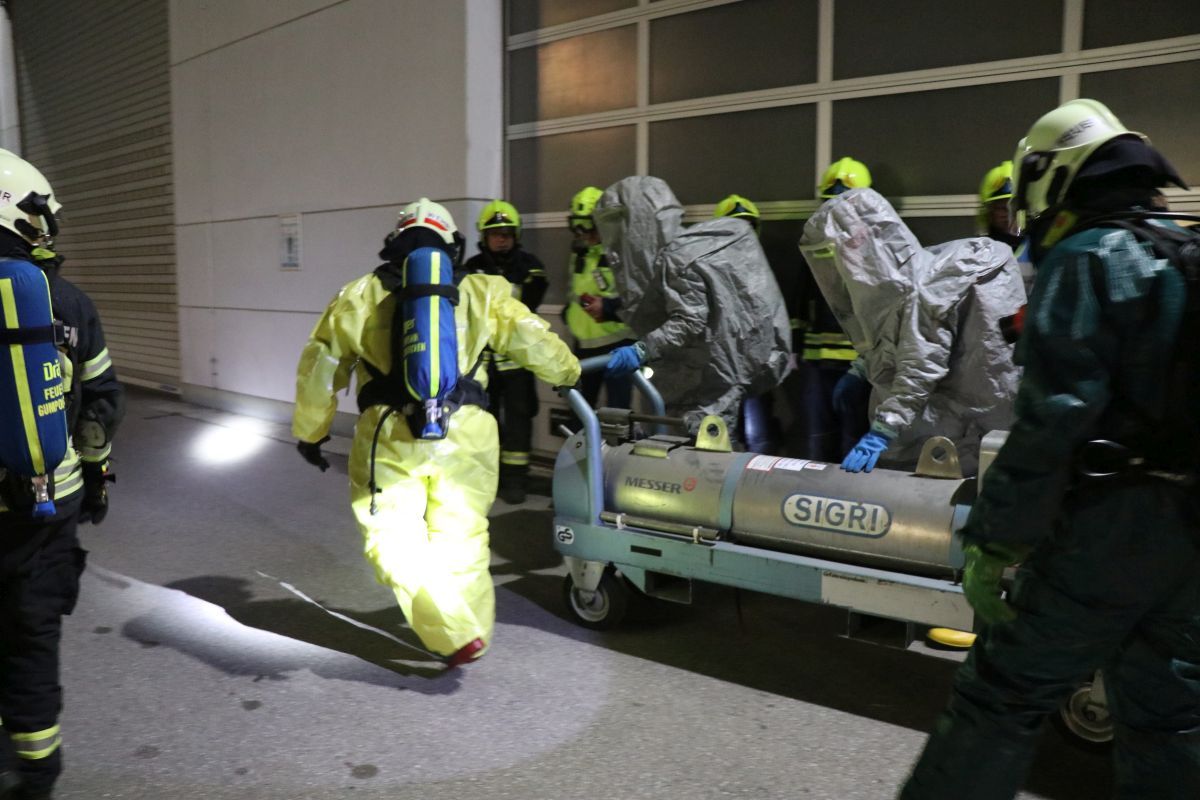 Übungsannahme war ein Zwischenfall beim Hantieren mit Chlorgasflaschen auf dem Gelände der Firma Messer Austria GmbH. Eine Flasche war undicht geworden, wodurch mehrere Personen im Gefahrenbereich zusammenbrachen. Bei der anschließenden Räumung des Areals kam es zu einem weiteren Zwischenfall: Arbeiter führten Schweißarbeiten durch und setzten durch ihre Flucht eine Lagerhalle in Brand. Ein Atemschutztrupp ging zur Erkundung und Menschenrettung vor. Parallel dazu errichteten weitere Kräfte einen Dekontaminationsplatz und nahmen die Brandbekämpfung der Lagerhalle mit mehreren C-Löschleitungen auf. Mehrere Trupps in Schutzstufe 2 führten die Bergung der undichten Gasflasche durch. Dabei kam der Flaschenbergewagen der Firma Messer Austria zum Einsatz.