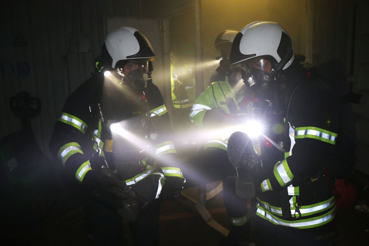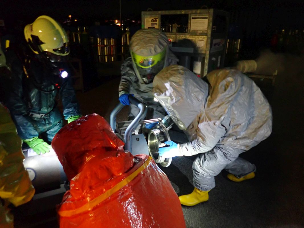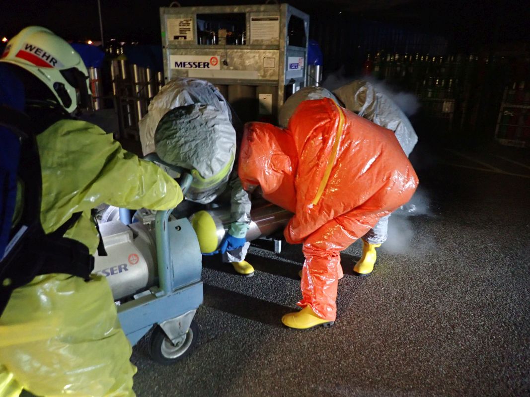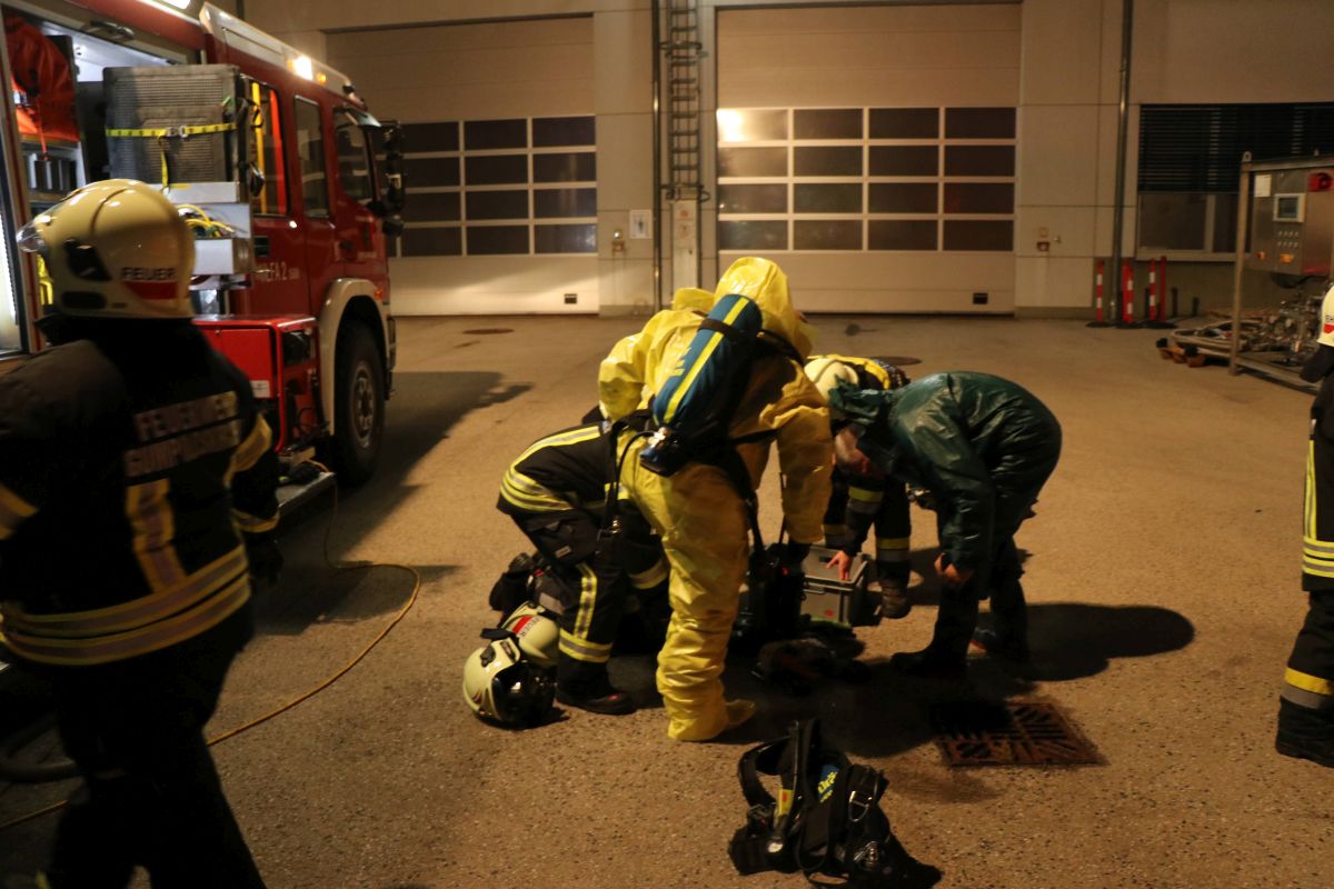 Übungsannahme war ein Zwischenfall beim Hantieren mit Chlorgasflaschen auf dem Gelände der Firma Messer Austria GmbH. Eine Flasche war undicht geworden, wodurch mehrere Personen im Gefahrenbereich zusammenbrachen. Bei der anschließenden Räumung des Areals kam es zu einem weiteren Zwischenfall: Arbeiter führten Schweißarbeiten durch und setzten durch ihre Flucht eine Lagerhalle in Brand. Ein Atemschutztrupp ging zur Erkundung und Menschenrettung vor. Parallel dazu errichteten weitere Kräfte einen Dekontaminationsplatz und nahmen die Brandbekämpfung der Lagerhalle mit mehreren C-Löschleitungen auf. Mehrere Trupps in Schutzstufe 2 führten die Bergung der undichten Gasflasche durch. Dabei kam der Flaschenbergewagen der Firma Messer Austria zum Einsatz.